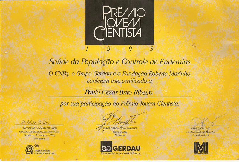 Em 1993, representado pelo seu filho, Paulo Ribeiro, munido de uma vasta documentação além de um ofício nº 521/93 expedido pelo então Reitor da Universidade Estadual de Feira de Santana-BA , Prof. Josué da Silva Mello, participou de um projeto de âmbito nacional organizado pela Fundação Roberto Marinho,Grupo Gerdau e CNPQ, o prêmio Jovem Cientista, obtendo um certificado de participação.